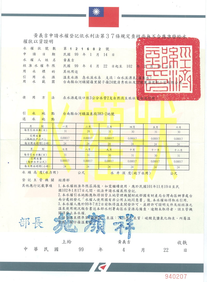 水權狀號數:第121682號 核發機關:經濟部 核准年限:99年4月至102年2月 使用範圍:清秀旅社及麗湯渡假山莊