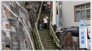 位於嶺頂公園東側的「好漢坡」,由嶺頂直通「火王爺廟」,計有二百九十二階,俗稱「二百棧」,氣勢不凡,後因興築環山道路而稍有縮減,不過,仍是考驗遊客體力和耐力的絕佳景點。