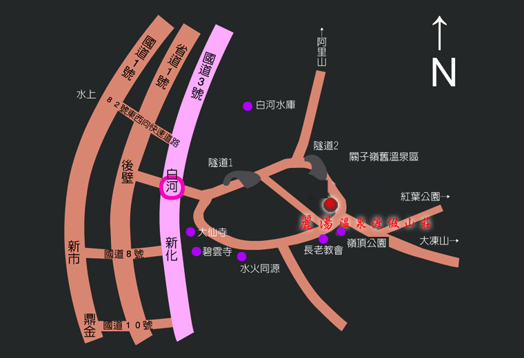 1、國道3號南二高下白河交流道下->循關子嶺方向前進->經過一個隧道即可到達"關子嶺溫泉區